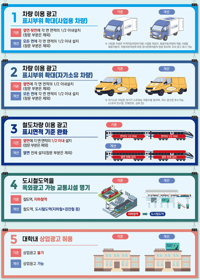 이에 기존에는 차량 이용 광고물의 표시 부위를 옆면 또는 뒷면으로 한정했으나 앞으로는 창문을 제외한 차체 모든 면에 각 면의 면적 1/2 이내로 광고물을 표시할 수 있다.