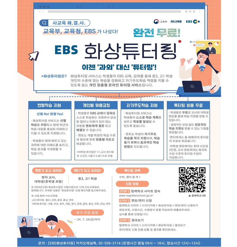 학생이 사교육 없이 교사나 대학생 멘토에게 질문하고 함께 토론하며 자기주도학습 역량을 키우는 무료 화상 튜터링 서비스가 시작된다.
