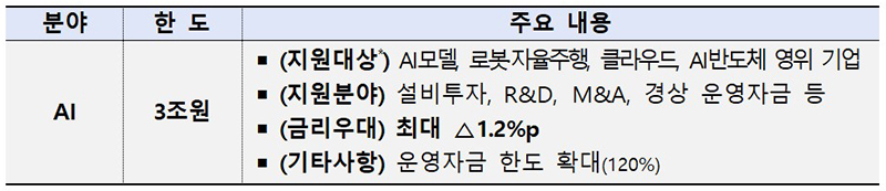 먼저 산업은행의 첨단산업 지원 프로그램인 초격차산업지원프로그램 내 AI분야를 신설해 올해 말까지 3조 원을 한도로 자금을 공급한다.