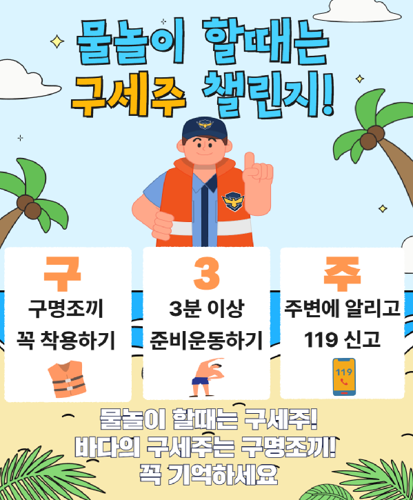 올해에는 ▲ 연안순찰 자원봉사(Volunteering+Tour) ▲ ‘물놀이 할때는 구세주!’ 챌린지 ▲ 연안안전 초성퀴즈 참여 행사 ▲ 전국 주요 해수욕장 등에서 생존수영・심폐소생술 교육, 구명조끼 착용 체험 활동을 운영한다고 밝혔다.